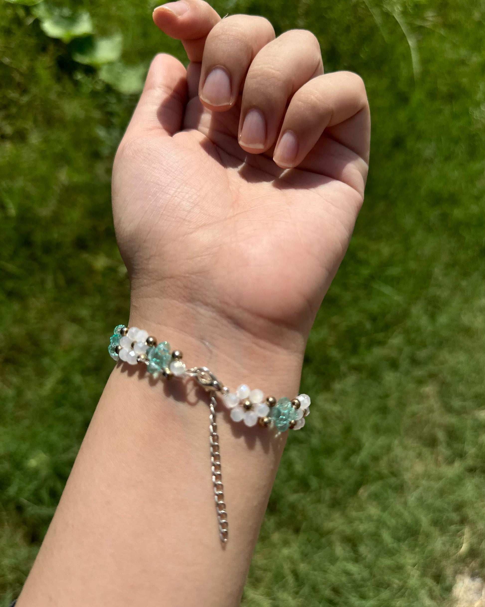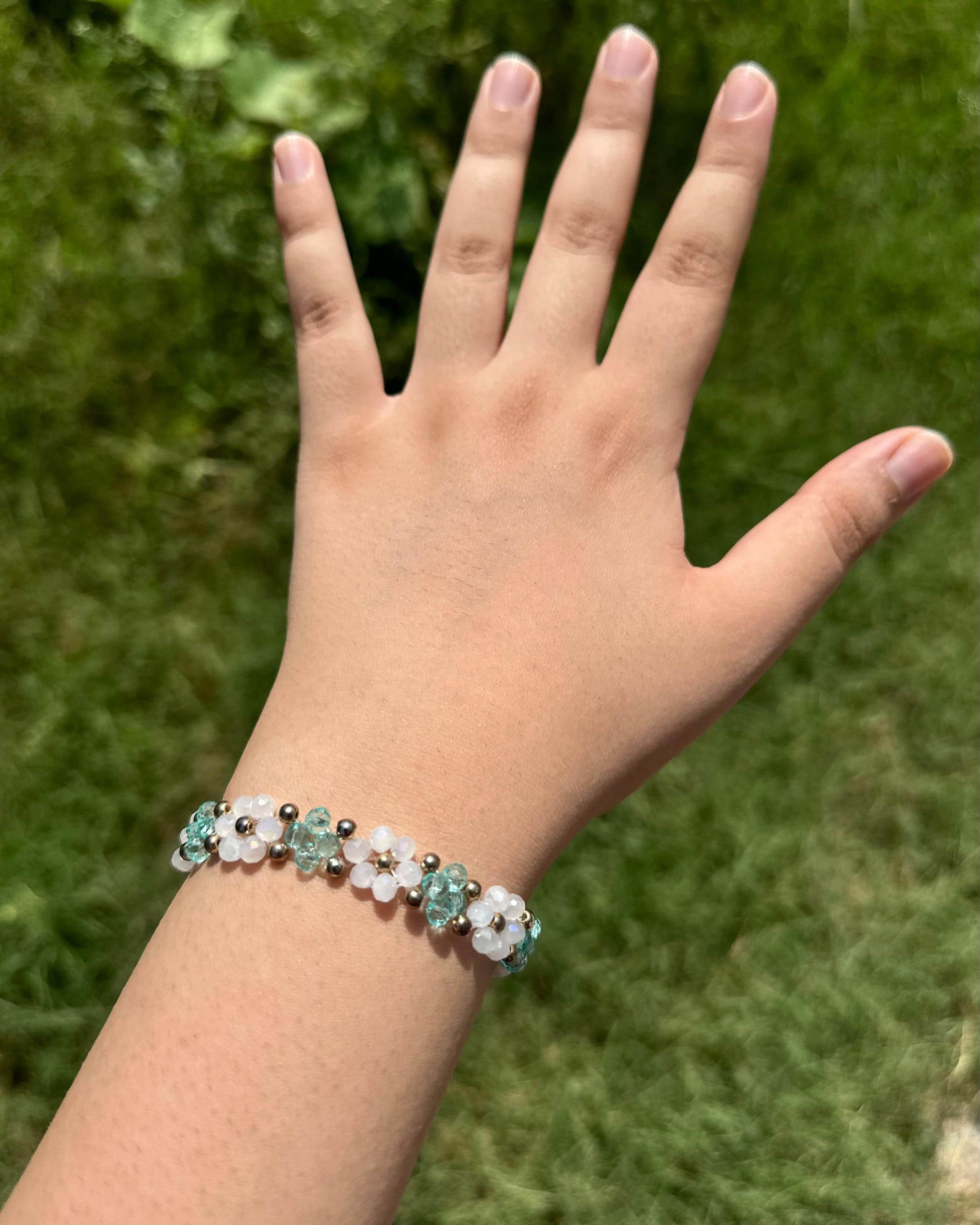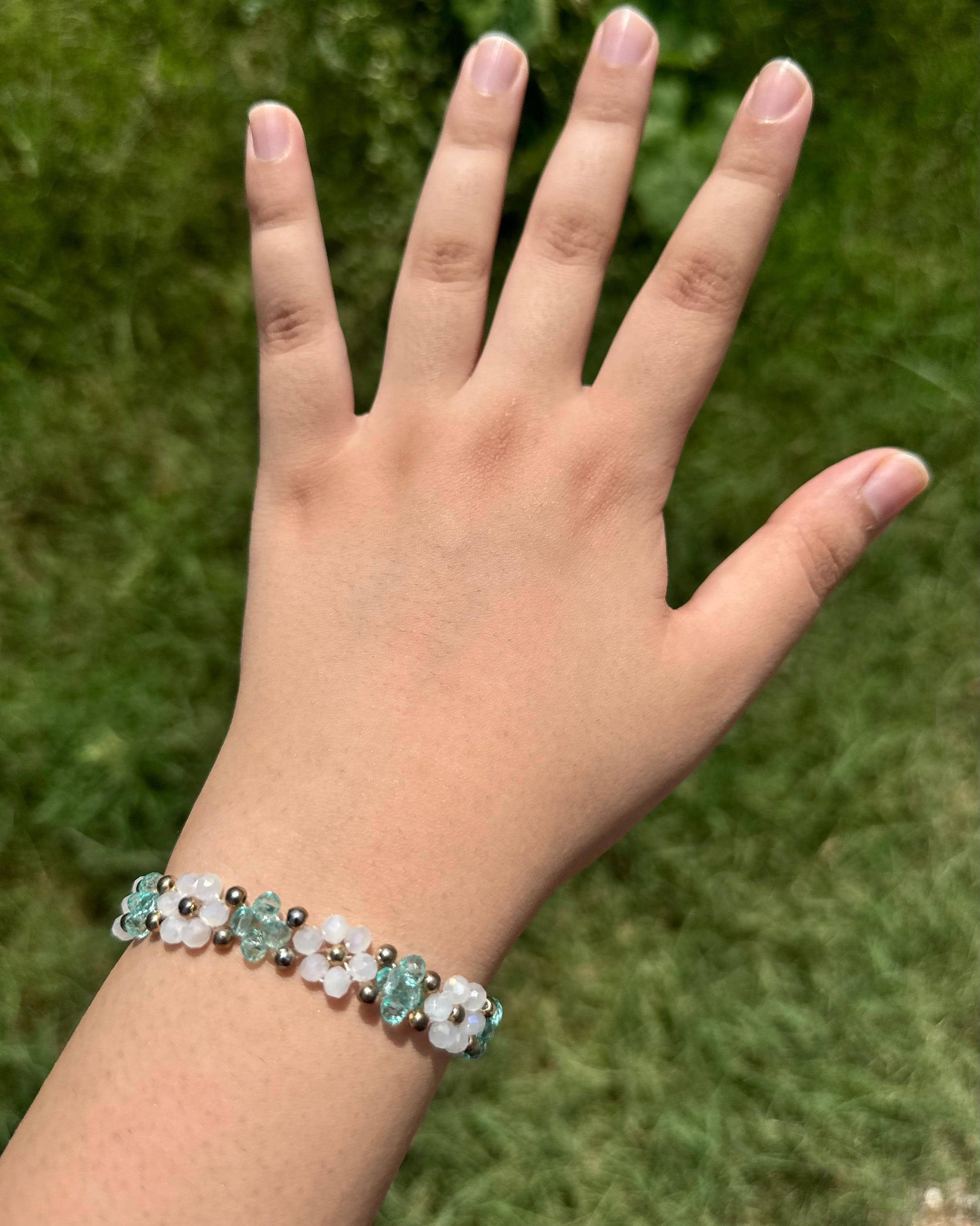 A delicate dance of baby pink and white crystal flowers, each crowned with a gleaming golden seed bead at its heart. This bracelet captures the romance of spring gardens in full bloom, perfect for adding a graceful touch to your everyday style or special occasions.