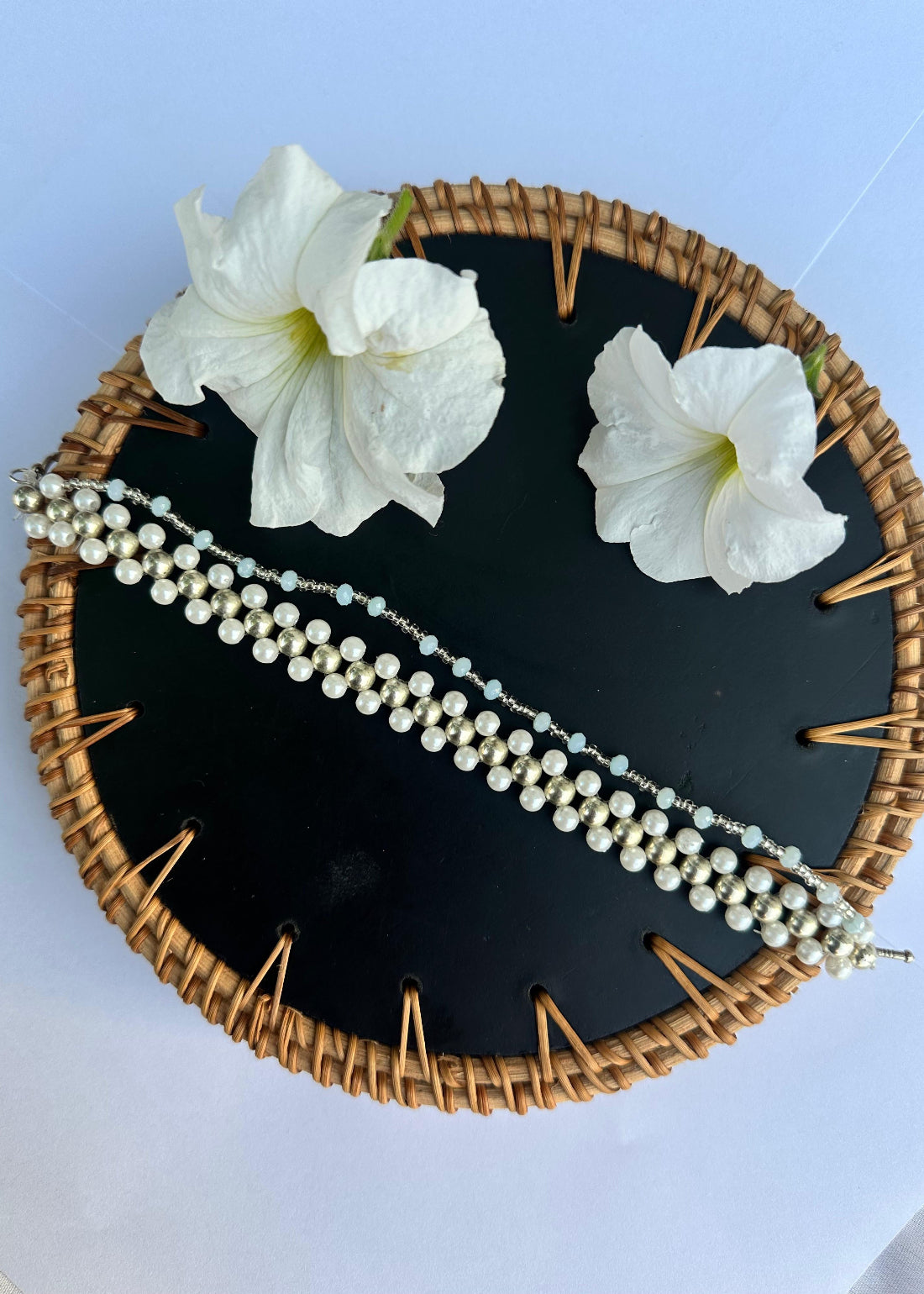 A sleek silver bead takes center stage, surrounded by soft white accents. One side flows into a graceful line of water and sky blue beads, capturing the calm beauty of a seaside morning. Perfect for adding a cool, refreshing touch to your style.